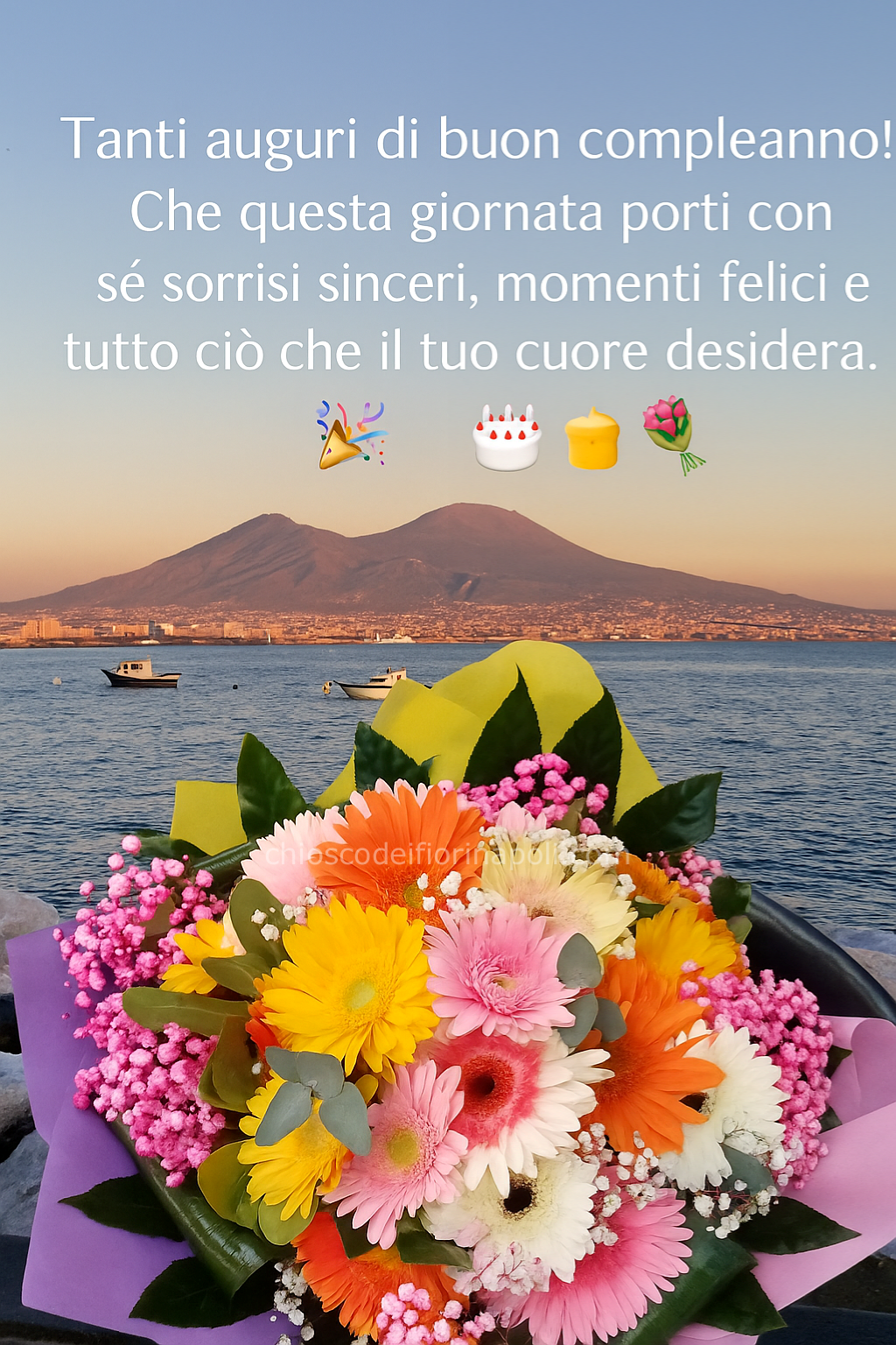 Il bouquet è un'esplosione di colori vivaci, dominata da gerbere in tonalità di giallo, arancione, rosa e bianco, che donano allegria e freschezza. È arricchito da piccoli fiori rosa e verdi, che aggiungono delicatezza, e da foglie decorative che ne esaltano la struttura. Avvolto in carta viola e gialla, il mazzo sprigiona eleganza e vivacità. Un nome perfetto potrebbe essere "Sole di Primavera", che richiama la luminosità dei colori e la sensazione di rinascita che trasmette