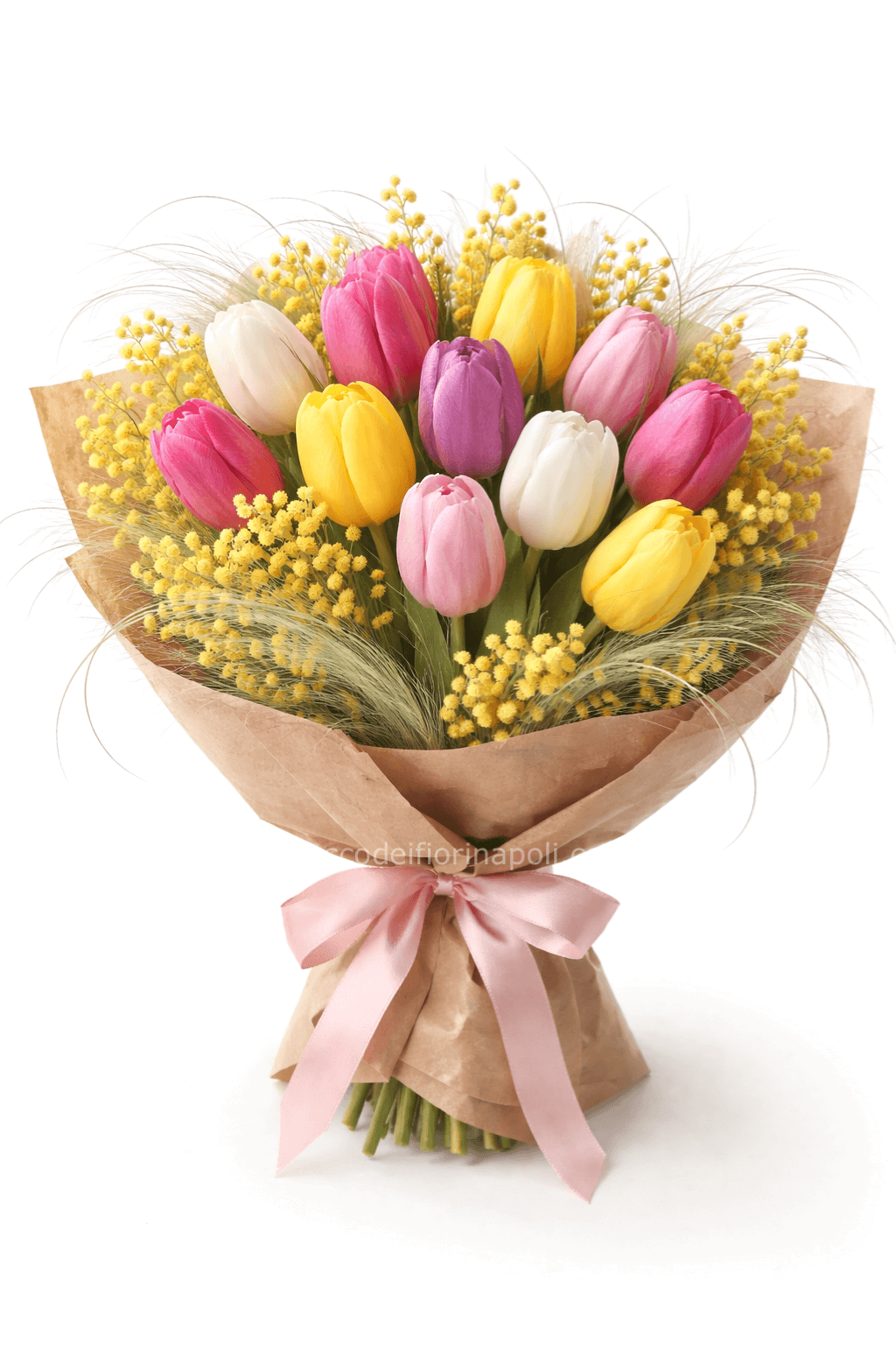 Bouquet fresco e luminoso composto da 10 tulipani misti nei toni del rosa, giallo, bianco, fucsia e viola, valorizzati da soffici rami di mimosa e linee leggere di erba bianca decorativa.