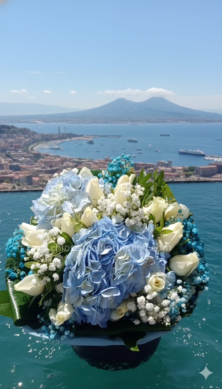Questo bouquet, dominante nei toni dell'azzurro cielo e del bianco puro, racchiude l'incanto di Napoli. Grandi ortensie celesti e rose bianche si fondono in una composizione vibrante