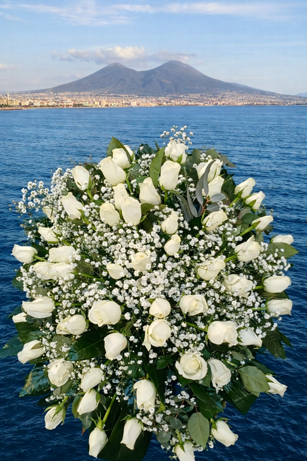Cuscino funebre elegante e delicato composto da raffinate rose arricchite da soffice nebbiolina e foglie verdi ornamentali. La composizione rotonda esprime rispetto, affetto e vicinanza nel ricordo di una persona cara, con uno stile sobrio e armonioso. Realizzato con cura artigianale e consegna a domicilio in tutta Napoli