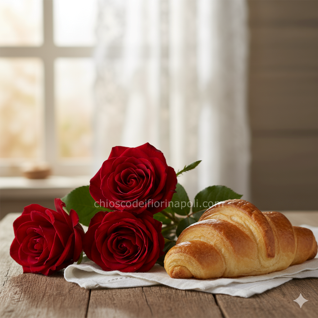 Tre rose rosse fresche e un cornetto caldo appena sfornato, consegnati insieme per trasformare il risveglio in un’emozione. Un gesto semplice ma profondamente romantico: profumo di petali, dolcezza del mattino e la sorpresa di un dono recapitato direttamente a casa con il nostro servizio di consegna a Napoli.