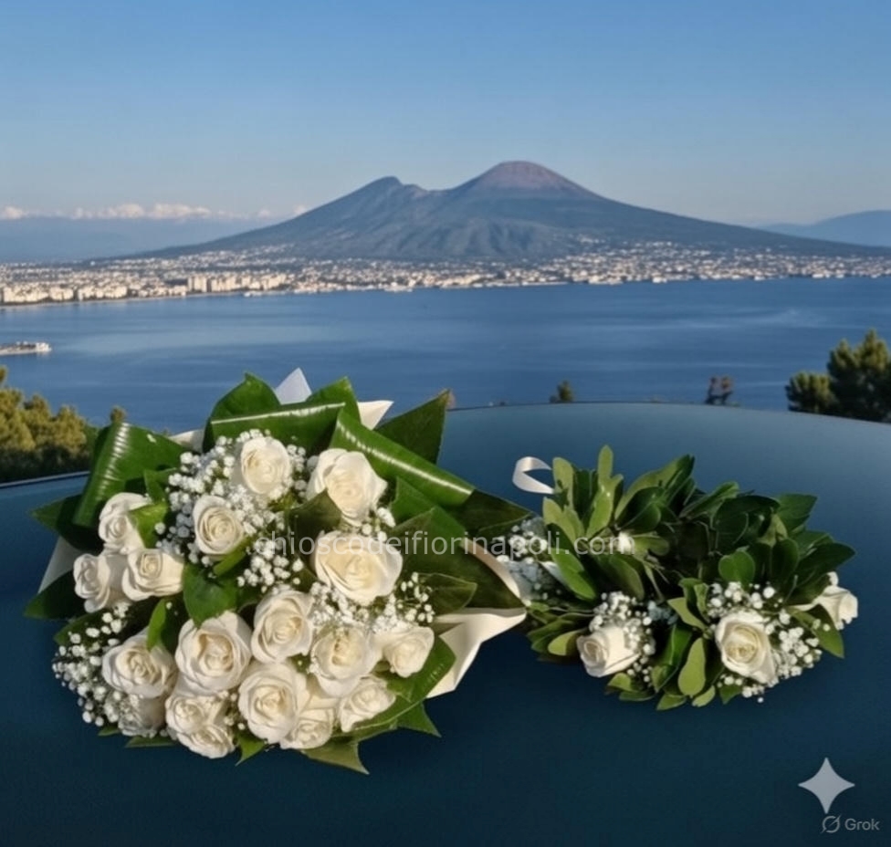 Un abbinamento pensato per rendere speciale il giorno della laurea: bouquet di rose con nebbiolina e coroncina coordinata in alloro e fiori bianchi. Il cliente può personalizzare sia il colore delle rose che il fiocco, creando un set unico e in linea con la propria facoltà o con i propri colori preferiti. Ideale per foto, festeggiamenti e consegne a domicilio su Napoli.