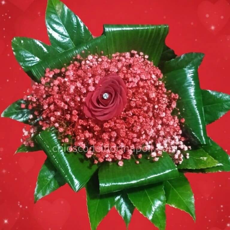 Questo bouquet esclusivo celebra l'amore con un design ricercato. Al centro brilla una rosa rossa impreziosita da un punto luce, circondata da una nuvola di gypsophila rossa vibrante. La composizione è incorniciata da ampie foglie verdi lucide che creano un contrasto moderno e scultoreo. Un omaggio floreale unico, perfetto per sigillare un momento indimenticabile con stile e passione.
