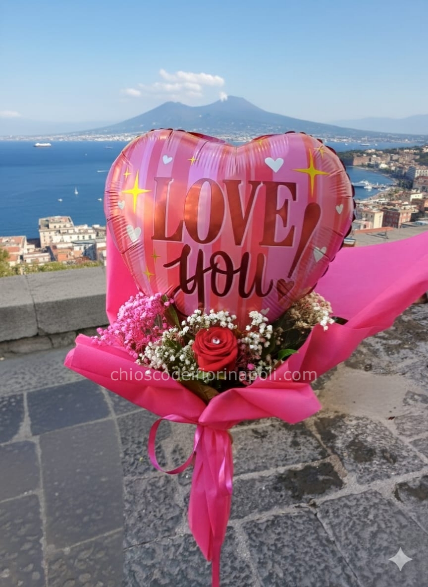 Bouquet composto da una rosa rossa, gypsophila bianca e fiori rosa, avvolto in carta e fiocco fucsia. Il palloncino a cuore con la scritta “LOVE YOU” aggiunge un tocco romantico. Sullo sfondo panoramica di Napoli con il Vesuvio, atmosfera perfetta per un messaggio d’amore.