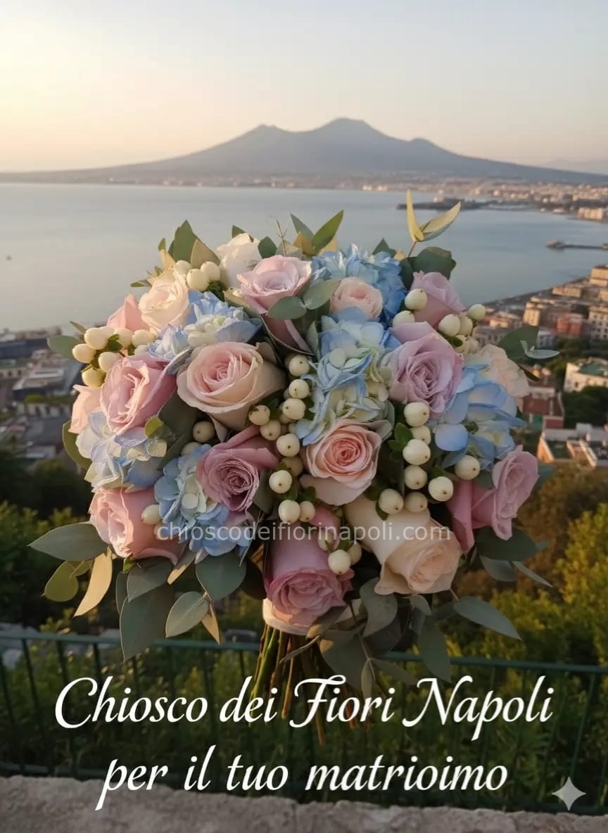 I toni pastello creano un’armonia raffinata, perfetta per un matrimonio dal gusto sobrio e chic. Sullo sfondo del Golfo di Napoli e del Vesuvio, il bouquet diventa un simbolo di amore e bellezza senza tempo, ideale per la sposa che desidera un tocco romantico e delicato nel suo giorno speciale.