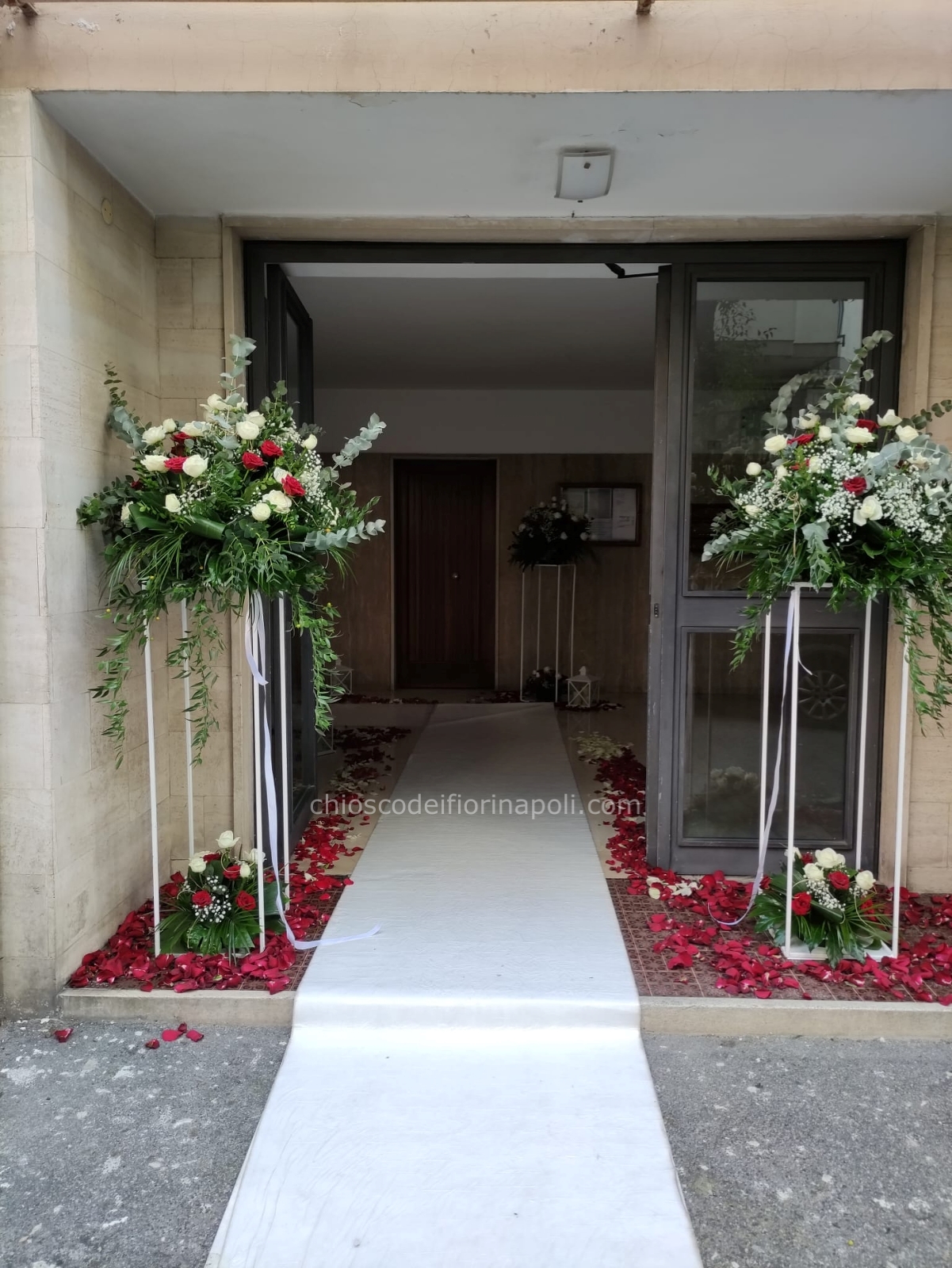 Un ingresso elegante e scenografico accoglie gli ospiti con un tappeto bianco impreziosito da petali di rose rosse. Ai lati, composizioni floreali su strutture in ferro battuto, con una composizione superiore e una inferiore per lato, uniscono rose bianche e rosse, nebbiolina ed eucalipto, creando un effetto armonioso e raffinato. Nastri delicati completano l’allestimento, guidando verso un percorso romantico e indimenticabile.