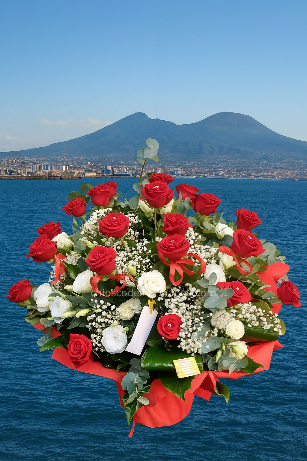 Elegante composizione floreale realizzata con rose rosse e bianche, nebbiolina e foglie di eucalipto, impreziosita da dettagli in tessuto rosso. Ideale per celebrare con raffinatezza momenti speciali, unisce passione e purezza in un equilibrio perfetto. Disponibile per consegna a domicilio a Napoli e provincia.
