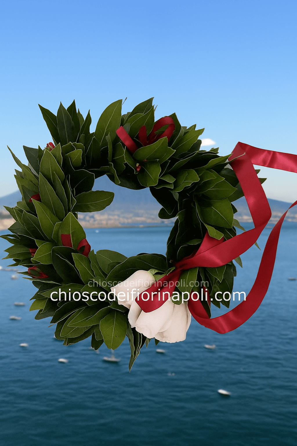 Un tocco distintivo è dato dalla presenza di rose bianche annodate con il nastro, che aggiungono raffinatezza e un contrasto delicato con il verde dell'alloro. L'insieme trasmette classe e solennità, perfetto per celebrare un traguardo così importante.