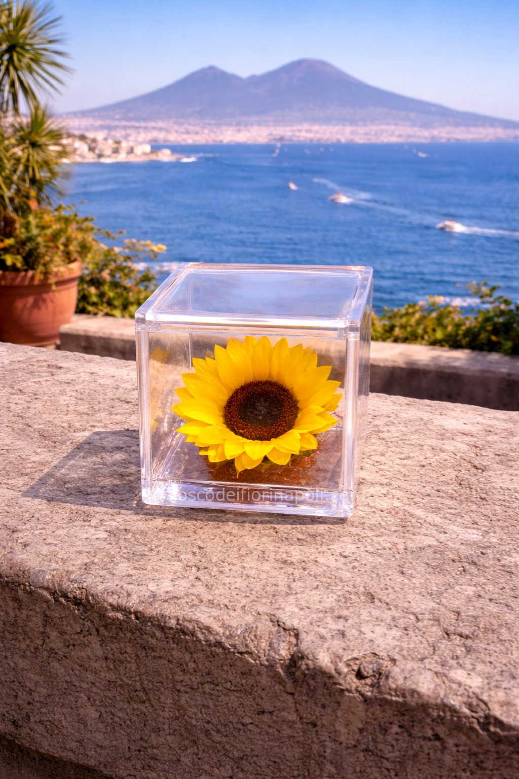 Girasole stabilizzato racchiuso in una elegante scatola trasparente. I petali giallo intenso mantengono colore e forma nel tempo, senza bisogno di acqua o manutenzione. Simbolo di energia, positività e luce, è ideale come regalo duraturo o come complemento d’arredo luminoso per casa, ufficio o negozio. Un fiore che trasmette allegria ogni giorno.