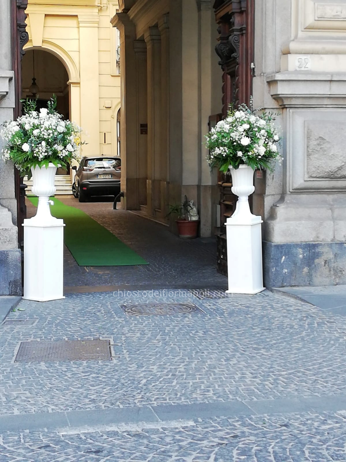 Un ingresso raffinato e luminoso accoglie gli ospiti con due eleganti composizioni floreali su colonne bianche, posizionate ai lati del portone. I fiori bianchi, arricchiti da nebbiolina e verdi decorativi, creano un effetto armonioso e delicato, perfetto per un’atmosfera romantica. Il tappeto guida lo sguardo verso l’interno, valorizzando l’entrata e trasformando la casa in uno scenario curato ed elegante per il giorno del matrimonio.