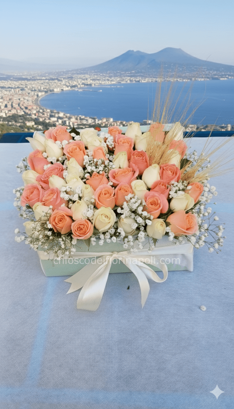 scatola con rose bianche e color pesca/salmone, arricchito da velo