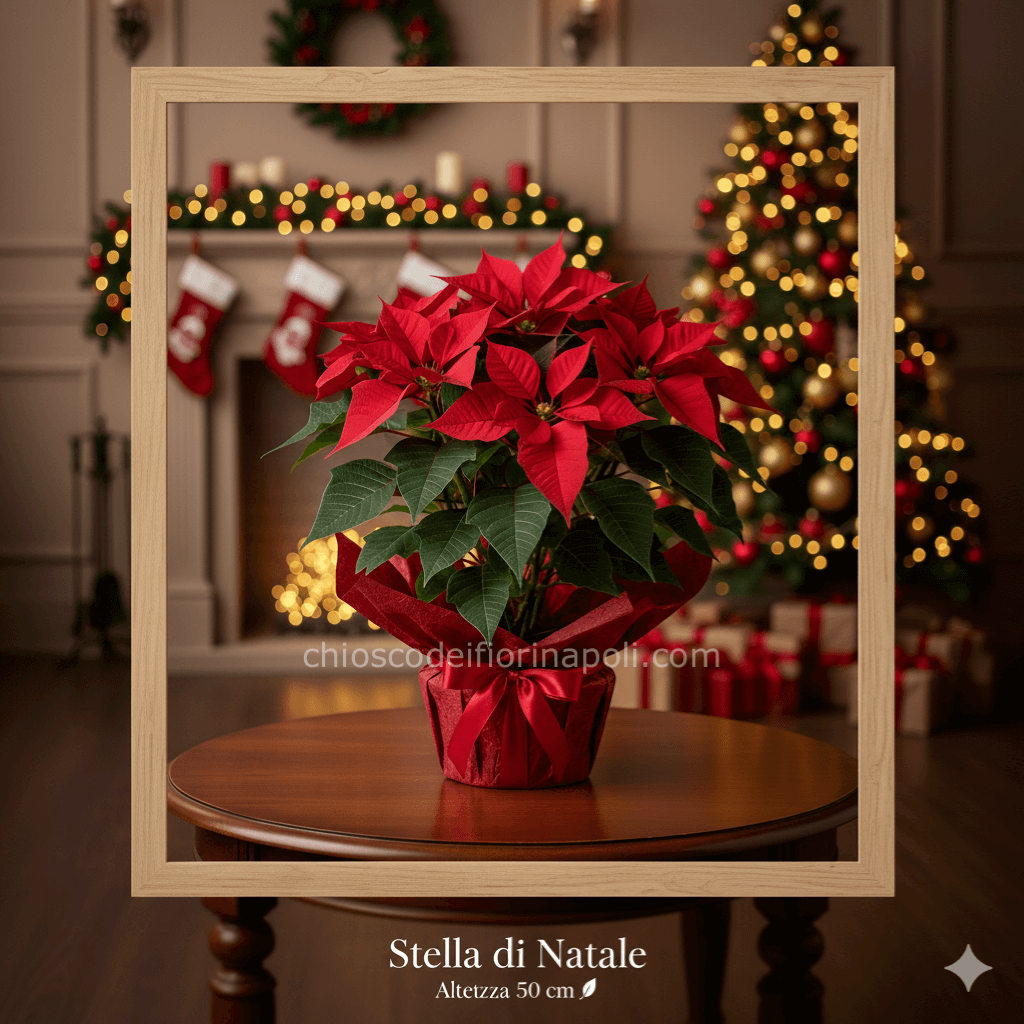 La nostra Stella di Natale da 50 cm è il simbolo di eleganza. Brattee rosso rubino intenso e fogliame lussureggiante in una confezione festiva. Perfetta per il tuo angolo natalizio, diffonde calore e magia un dono recapitato direttamente a casa con il nostro servizio di consegna a Napoli