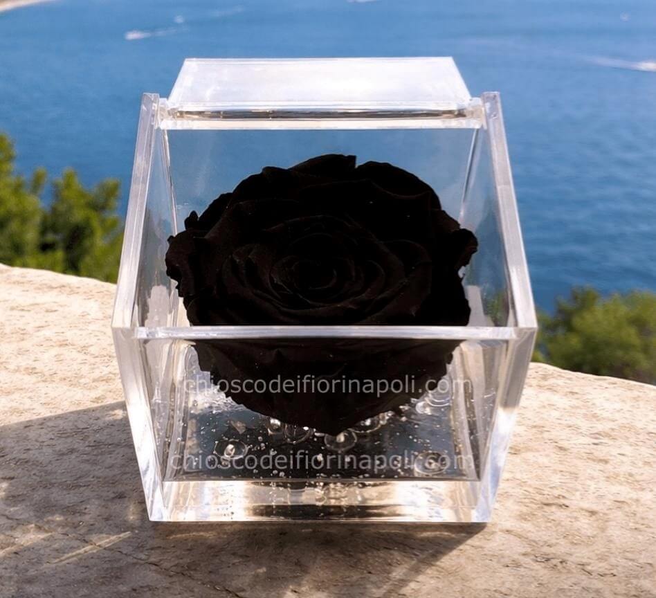 Rosa stabilizzata nera racchiusa in una raffinata scatola trasparente, elegante e moderna. Un fiore vero trattato per durare nel tempo senza acqua né manutenzione. Simbolo di fascino, intensità e amore eterno, valorizzato dallo sfondo iconico del Golfo di Napoli. Perfetta come regalo esclusivo o complemento d’arredo di grande impatto.
