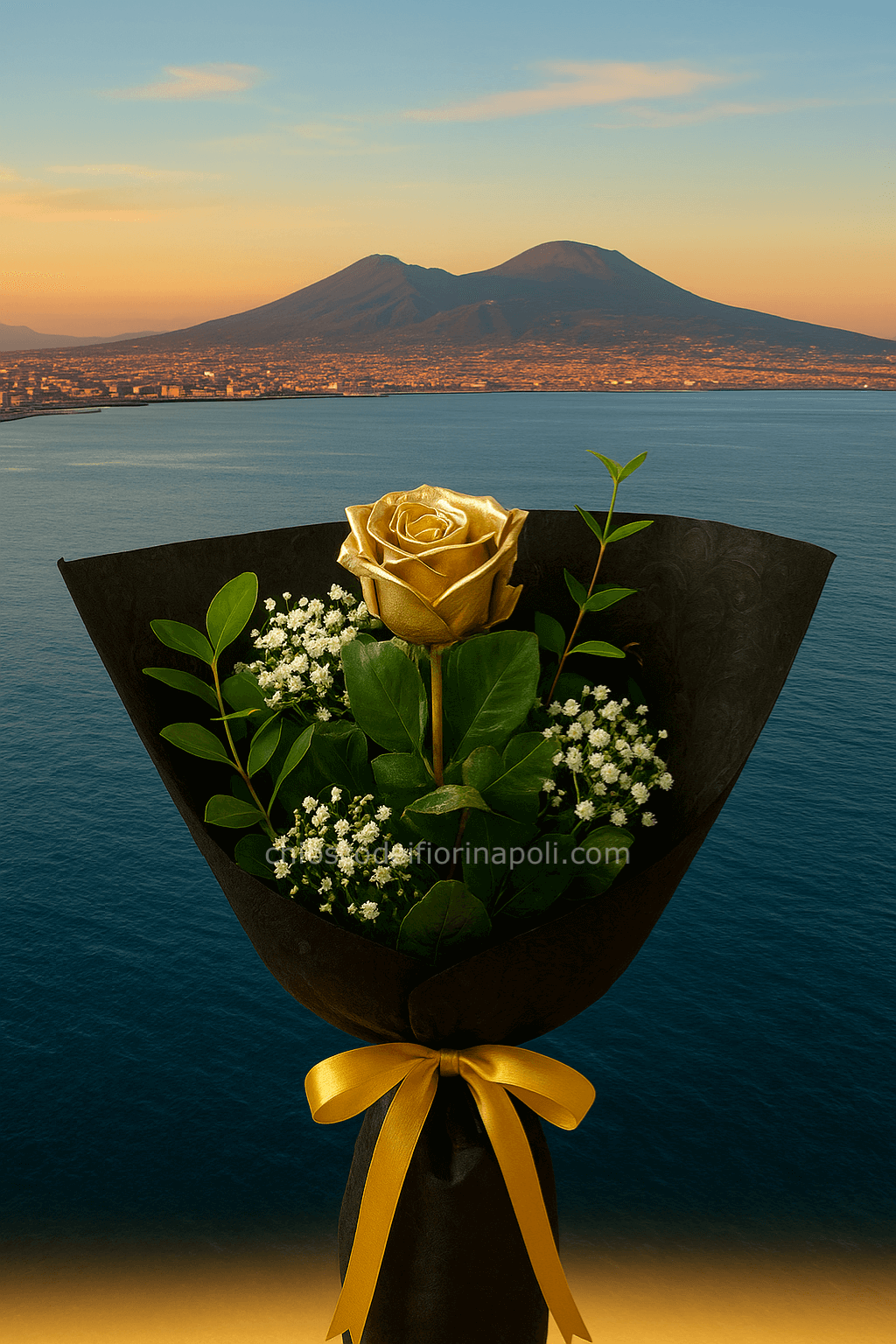 Rosa dorata elegante e luminosa, avvolta in una raffinata carta nera che ne esalta il colore caldo e prezioso. Il contrasto tra l’oro brillante dei petali e la profondità del nero crea un effetto di grande impatto visivo, simbolo di eleganza, mistero e successo. Un dono che trasmette prestigio e ammirazione senza bisogno di parole.