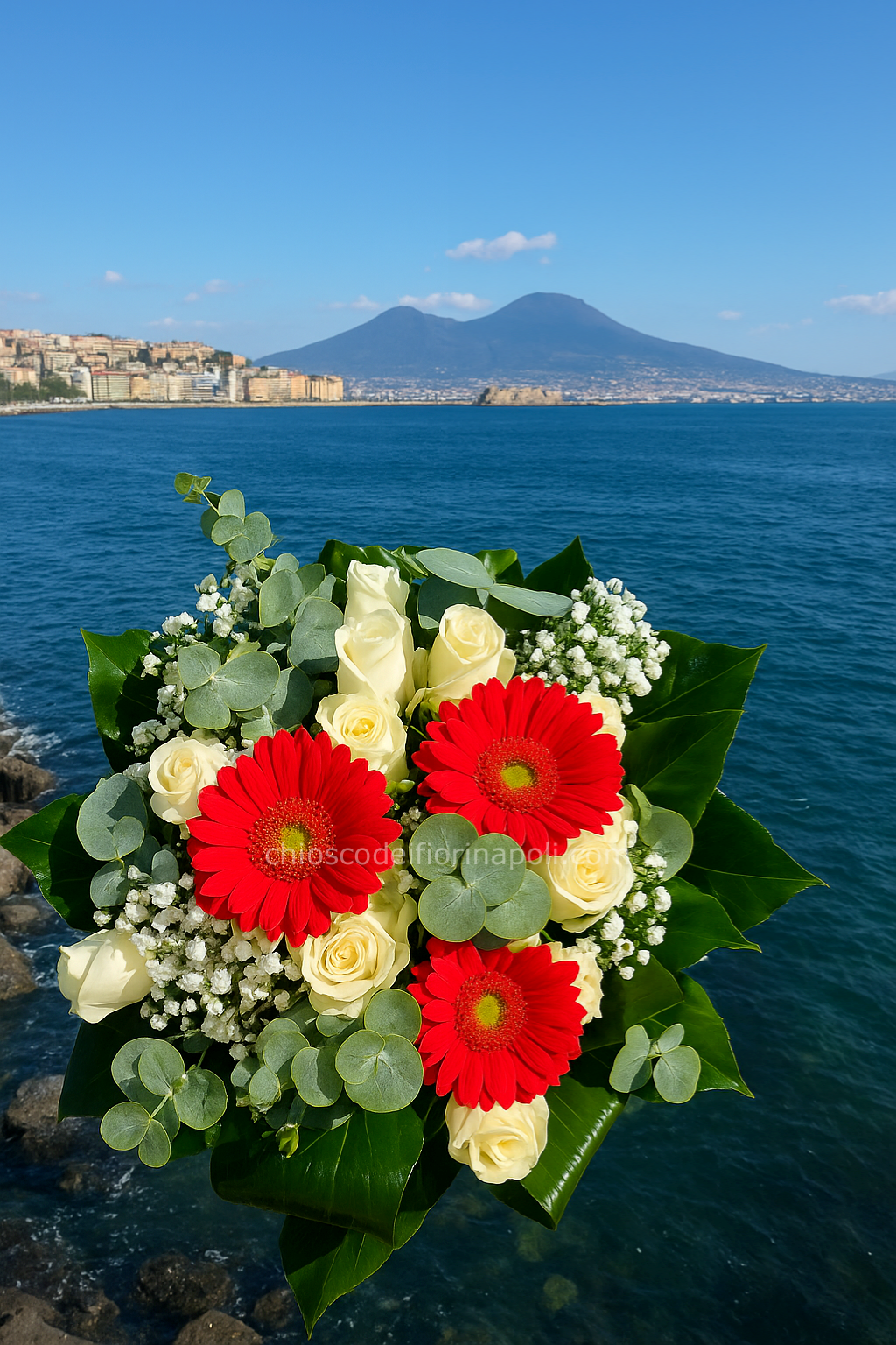 Un bouquet elegante e luminoso composto da rose bianche, gerbere rosse, nebbiolina e rami di eucalipto, avvolti da grandi foglie verdi che ne esaltano la forma compatta e armoniosa. L’unione del bianco e del rosso crea un contrasto raffinato, ideale per esprimere amore e gratitudine con semplicità e classe