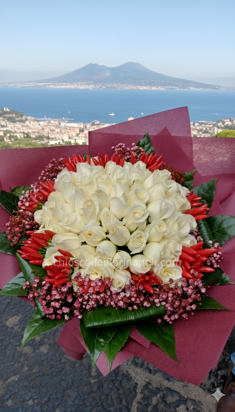 Un magnifico bouquet di rose bianche, vibranti peperoncini rossi e piccoli fiori rosa si staglia in primo piano, incorniciato da foglie verde intenso