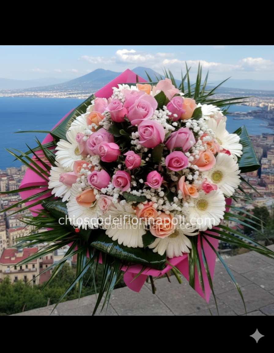 Un bouquet dai toni rosa delicati, composto da eleganti rose e vivaci gerbere, simboli di amore e gioia. L’armonia tra le sfumature rosate e il verde del fogliame crea una composizione romantica e luminosa, perfetta per esprimere dolcezza e affetto sincero.