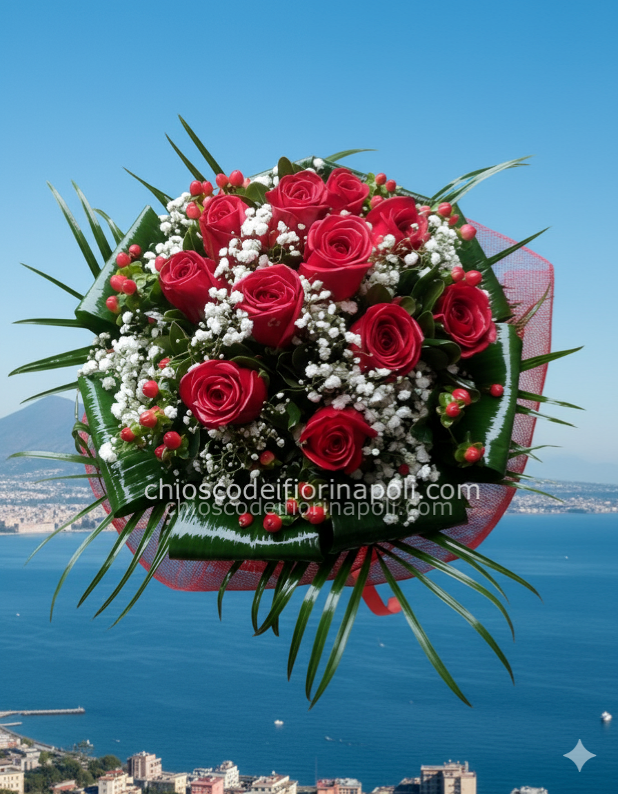 Celebra l'amore con questo sontuoso bouquet di rose rosse, simbolo eterno di passione e romanticismo. Ogni rosa, vibrante e vellutata, è magnificamente accostata a un soffice contorno di nebbiolina bianca e bacche rosse decorative, creando un contrasto visivo mozzafiato. Il fogliame verde scuro aggiunge profondità ed eleganza, rendendo questa composizione floreale il regalo perfetto per esprimere sentimenti sinceri e duraturi in ogni occasione speciale.
