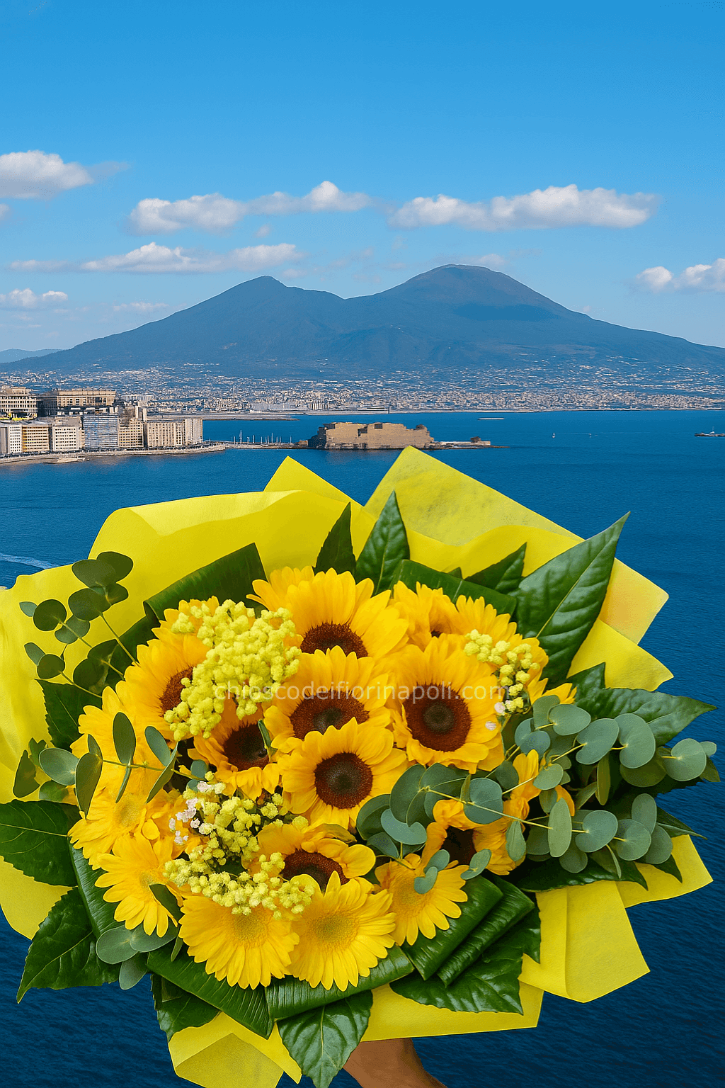 Un bouquet che sprigiona luce e allegria: girasoli e gerbere gialle si intrecciano con eucalipto e nuvoletta gialla, avvolti in un elegante manto verde e carta gialla. Il colore del sole domina la composizione, portando calore e vitalità. Perfetto per donare energia e sorrisi in ogni occasione.
