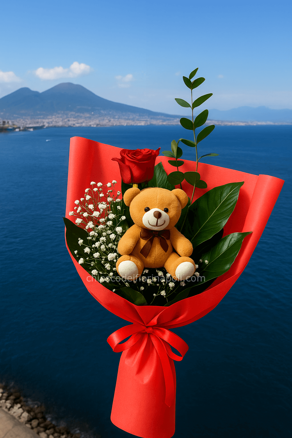 Un bouquet romantico con rosa rossa, nebbiolina ed eucalipto, impreziosito da un tenero orsacchiotto. Il tutto avvolto in carta rossa brillante, sospeso sullo sfondo del Golfo di Napoli per un effetto elegante e affettuoso. Perfetto per sorprendere con dolcezza.