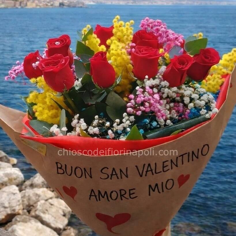Bouquet con 10 rose rosse dal colore intenso, arricchito da mimosa, gypsophila ed elementi floreali rosa. Le rose, fresche e piene, creano un contrasto romantico e luminoso. Su richiesta, scriviamo a mano sulla carta la dedica “Buon San Valentino Amore Mio”, per un tocco unico e personalizzato.