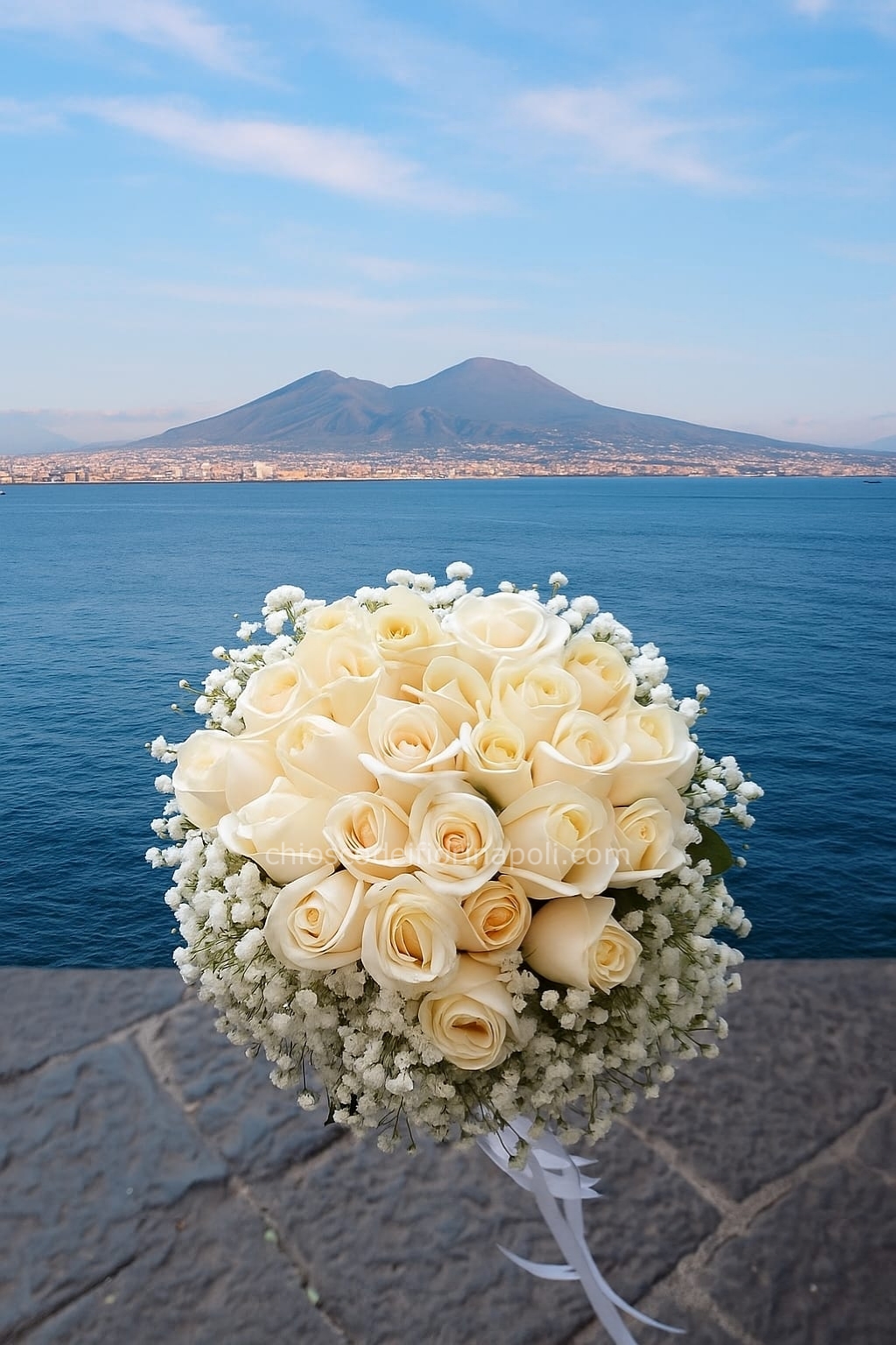 Questo bouquet da sposa è un elegante e raffinato mazzetto composto da rose avorio, simbolo di purezza e amore eterno. La rotondità compatta dei fiori crea un effetto armonioso e sofisticato, impreziosito dall’aura delicata della nebbiolina che lo avvolge come una nuvola candida. Rifinito con un nastro bianco, è la scelta ideale per una sposa romantica e senza tempo, che desidera un bouquet classico ma sempre d’impatto.
