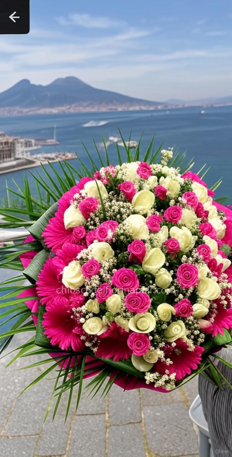 Bouquet Sussurro del Golfo: un elegante intreccio di rose bianche e fucsia, gerbere vivaci e delicati gypsophila, avvolto da foglie verdi