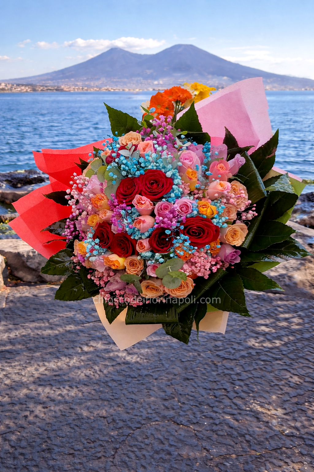 Bouquet elegante e ricco di colori, composto da rose rosse, rosa e pesca, arricchito da nebbiolina colorata e dettagli delicati che donano movimento e leggerezza. Il verde lucido esalta la composizione, mentre l’incarto moderno lo rende perfetto per ogni occasione speciale. Un mix armonioso, ideale per sorprendere con stile e raffinatezza.